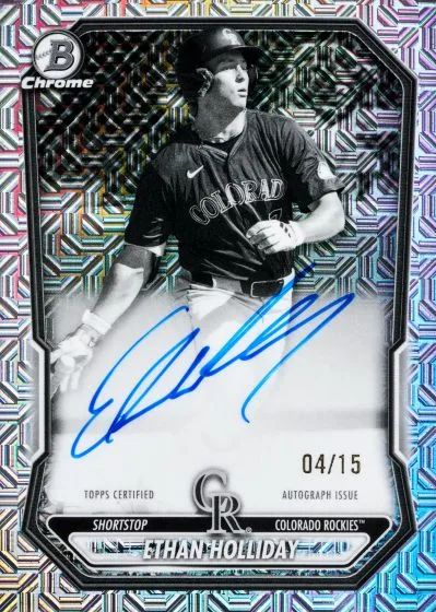 The autograph lineup is where Mega Box usually separates itself from the rest of the retail Bowman calendar, and 2026 looks no different. The 60-card Prospect Mega Autographs checklist includes names such as Ethan Holliday, Edward Florentino, Konnor Griffin, Marek Houston, Wyatt Sanford, Wehiwa Aloy, Roldy Brito, Seong-Jun Kim, Edgar Montero, Kaelen Culpepper, JoJo Parker, Juan Sanchez and Ryan Waldschmidt.