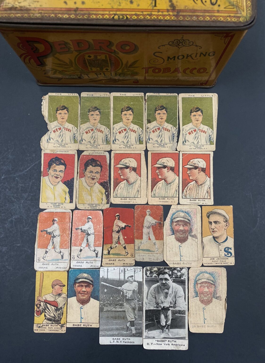 The tin contained a staggering array of more than 600 cards, all from the year 1926 or earlier. The cards' condition reflected their age and the love of the young hands that once held them—strip cards, often torn or cut and carried in pockets, showing signs of being cherished possessions. Among the collection, the presence of Babe Ruth was pronounced, with no fewer than 20 cards depicting the legendary "Bambino."